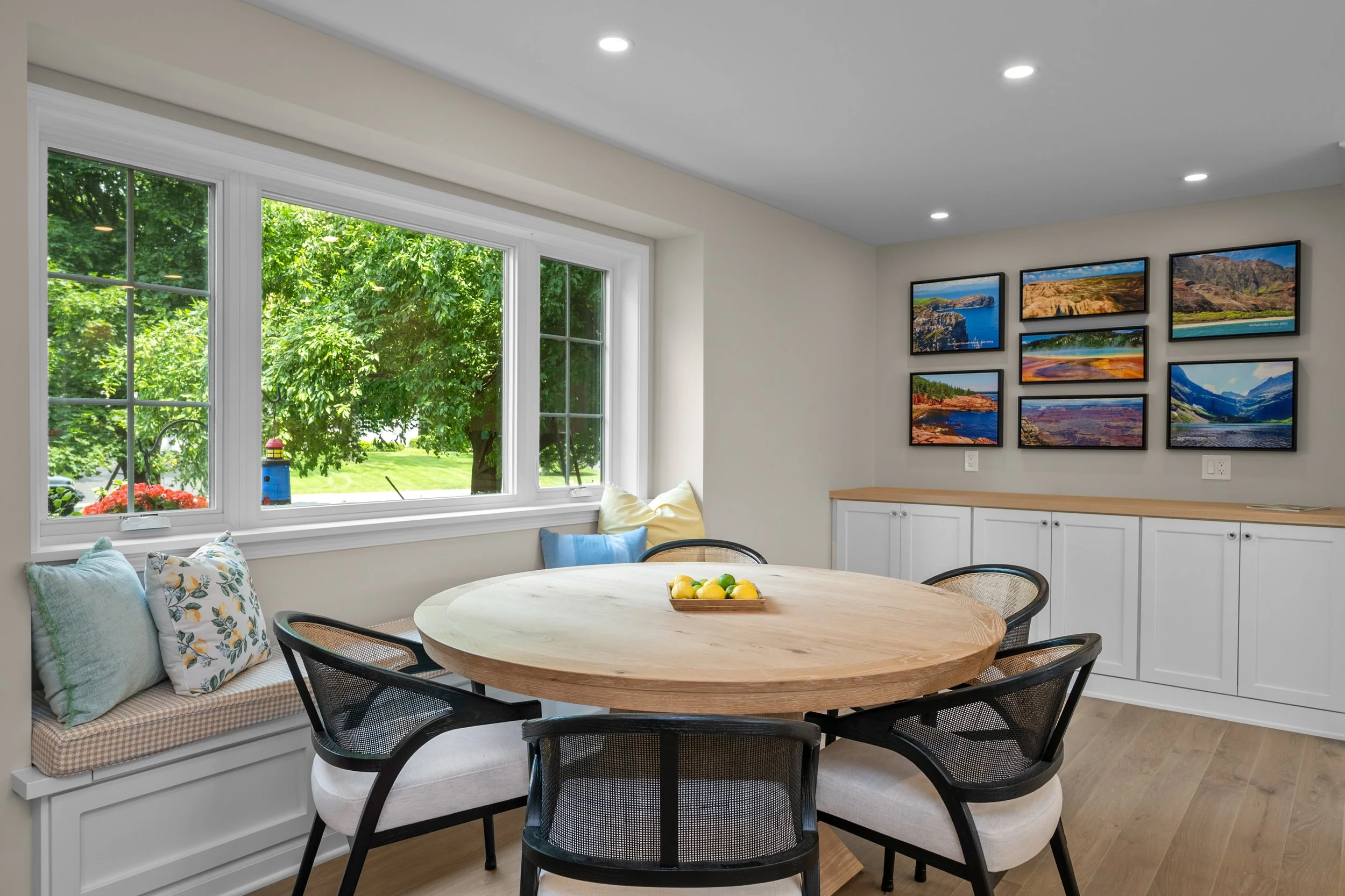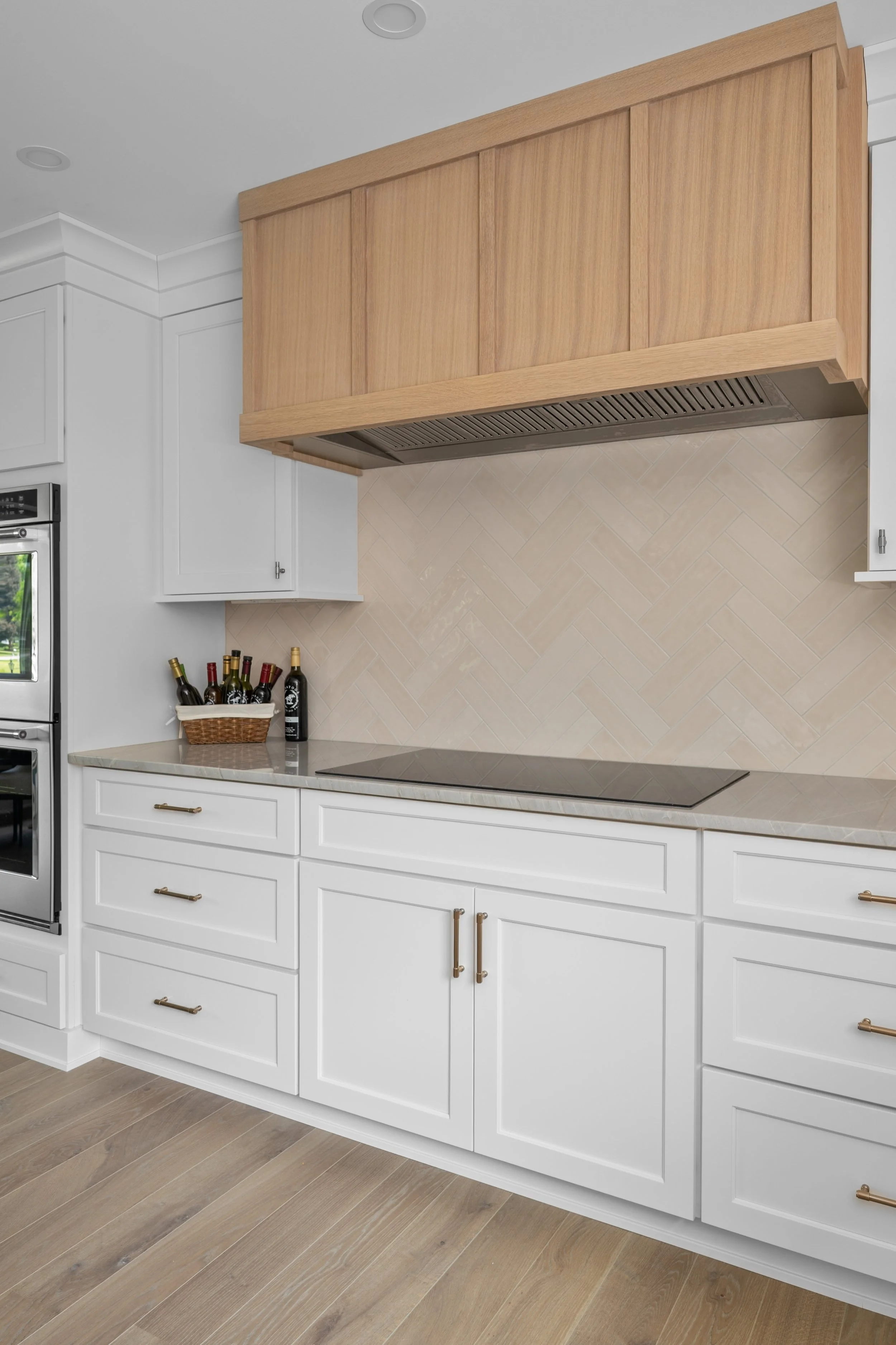 The project involved removing a structural wall between the kitchen and dining room to enhance the flow and connectivity. To maintain structural integrity while achieving a seamless ceiling line, we recessed a support beam into the ceiling. Large windows were added to flood the space with natural light, enhancing the warm, inviting atmosphere. The new kitchen features timeless white cabinetry, elegant brass hardware, and natural wood accents that add texture and warmth. A standout element is the custom bi-fold coffee cabinet, which is both functional and beautifully integrated, keeping everyday essentials tucked away while maintaining a clean, streamlined look. The result is a sophisticated, yet welcoming space perfect for everyday living and entertaining.